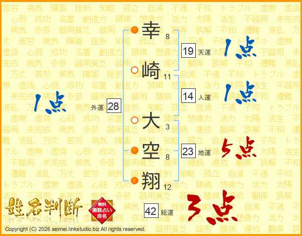 幸(8画)崎(11画) 大(3画)空(8画)翔(12画)