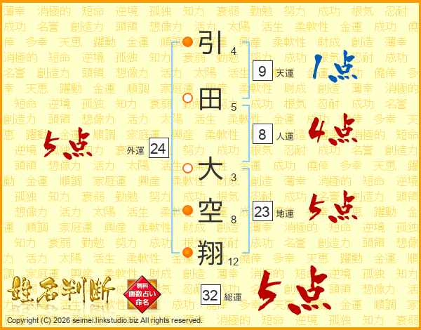 引(4画)田(5画) 大(3画)空(8画)翔(12画)