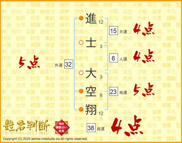 進(12画)士(3画) 大(3画)空(8画)翔(12画)