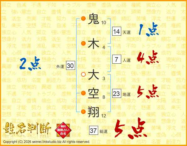 鬼(10画)木(4画) 大(3画)空(8画)翔(12画)