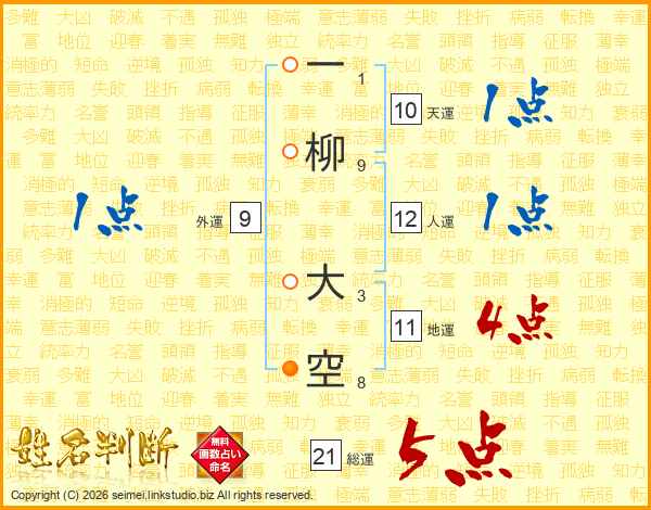一柳大空さんの総運は21画の5点!