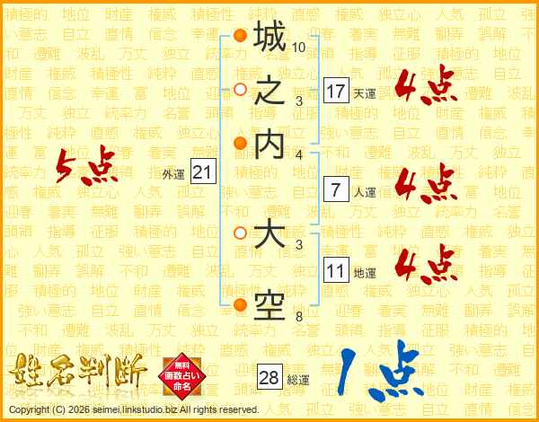 生活面を象徴する運勢です。外部から受ける影響力を表し、結婚運、家庭運や職場、環境への順応性を表します。総運から人運を引いた画数。姓や名が1文字の場合を除く。