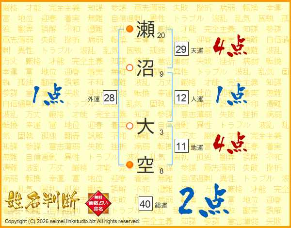 瀬沼大空さんの天運は29画の4点!