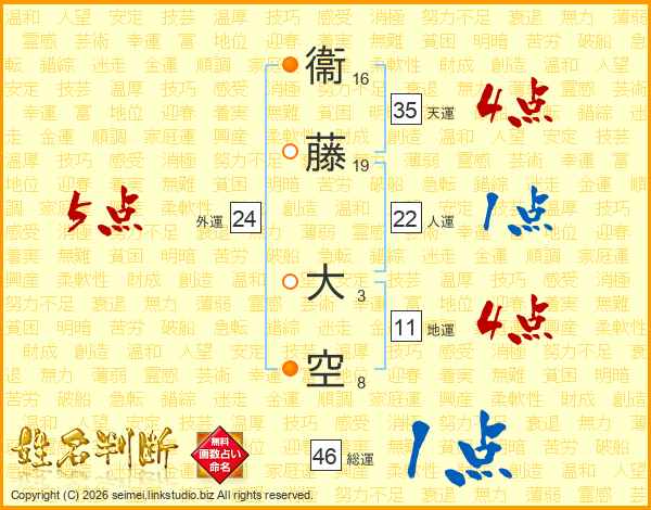 生活面を象徴する運勢です。外部から受ける影響力を表し、結婚運、家庭運や職場、環境への順応性を表します。総運から人運を引いた画数。姓や名が1文字の場合を除く。