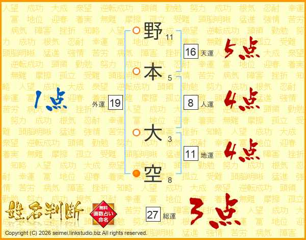 野本大空さんの総運は27画の3点!