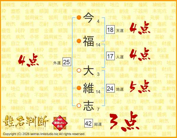 今(4画)福(14画) 大(3画)維(14画)志(7画)