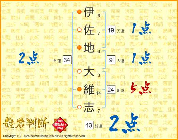 伊(6画)佐(7画)地(6画) 大(3画)維(14画)志(7画)