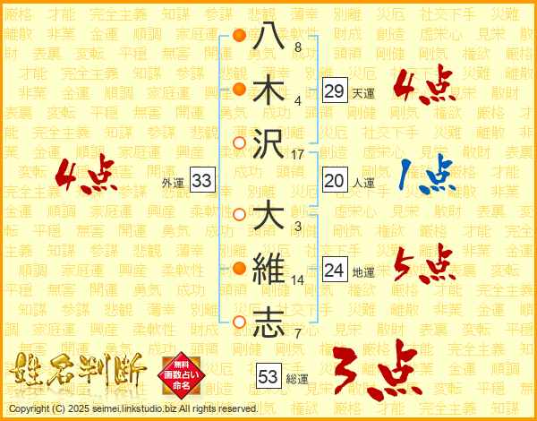 八(8画)木(4画)沢(17画) 大(3画)維(14画)志(7画)