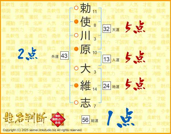 勅(11画)使(8画)川(3画)原(10画) 大(3画)維(14画)志(7画)