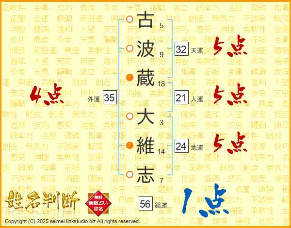 古(5画)波(9画)蔵(18画) 大(3画)維(14画)志(7画)
