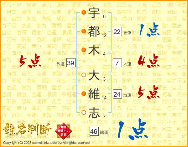 宇(6画)都(12画)木(4画) 大(3画)維(14画)志(7画)