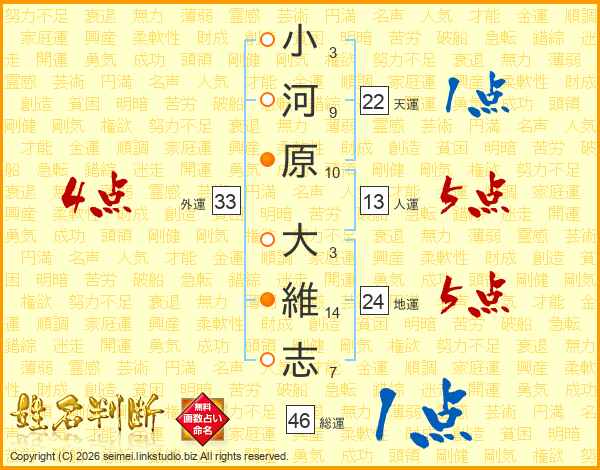 小(3画)河(9画)原(10画) 大(3画)維(14画)志(7画)