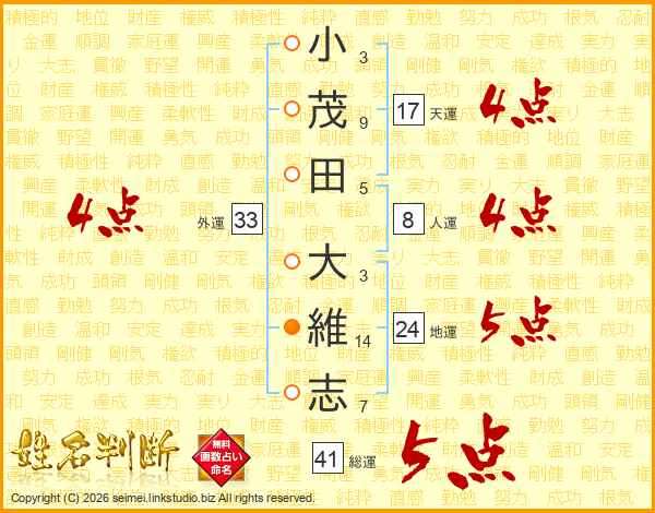 小(3画)茂(9画)田(5画) 大(3画)維(14画)志(7画)