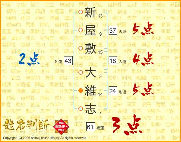 新(13画)屋(9画)敷(15画) 大(3画)維(14画)志(7画)