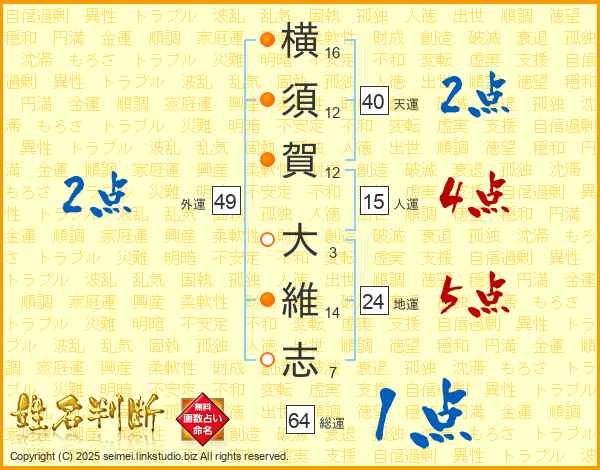 横(16画)須(12画)賀(12画) 大(3画)維(14画)志(7画)