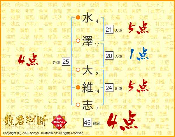 水(4画)澤(17画) 大(3画)維(14画)志(7画)