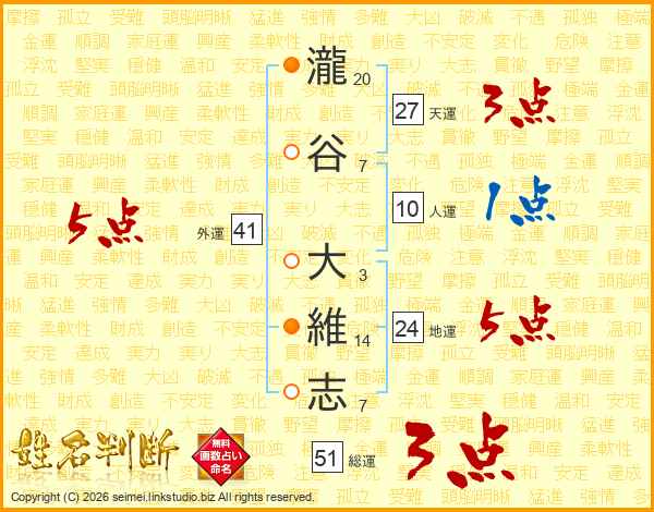 瀧(20画)谷(7画) 大(3画)維(14画)志(7画)