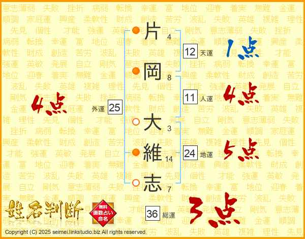 片(4画)岡(8画) 大(3画)維(14画)志(7画)