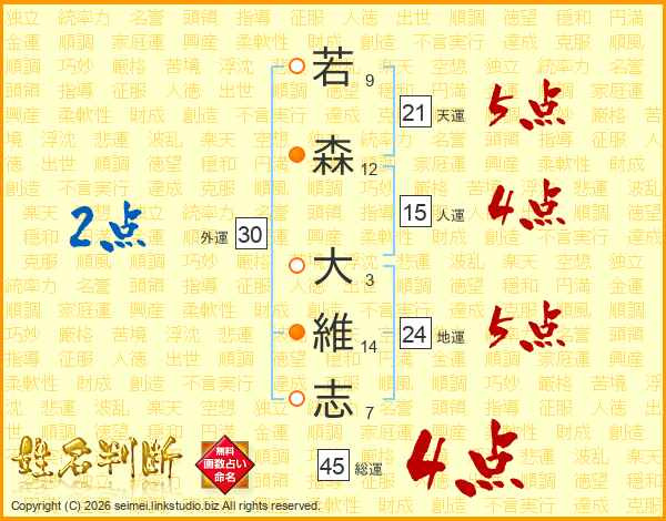 若(9画)森(12画) 大(3画)維(14画)志(7画)