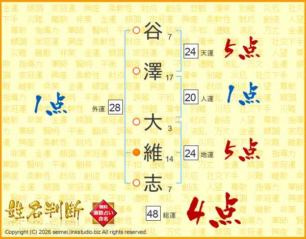 谷(7画)澤(17画) 大(3画)維(14画)志(7画)