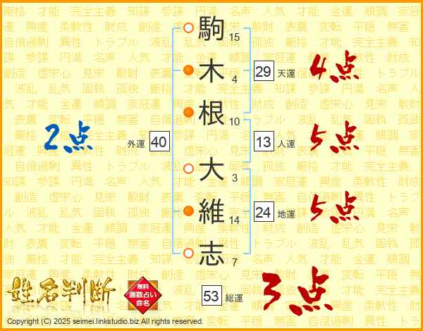 駒(15画)木(4画)根(10画) 大(3画)維(14画)志(7画)