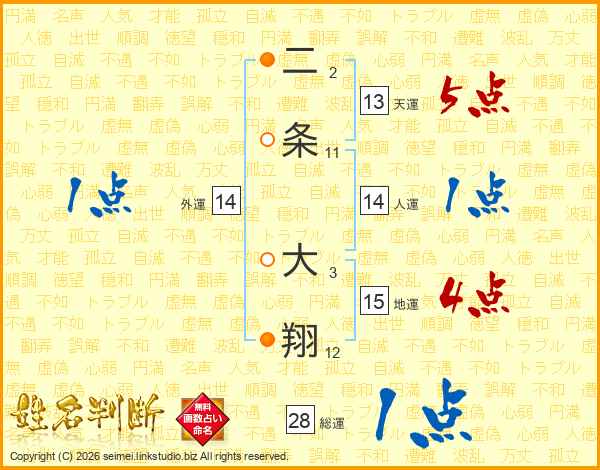 二条大翔さんの人運は14画の1点!