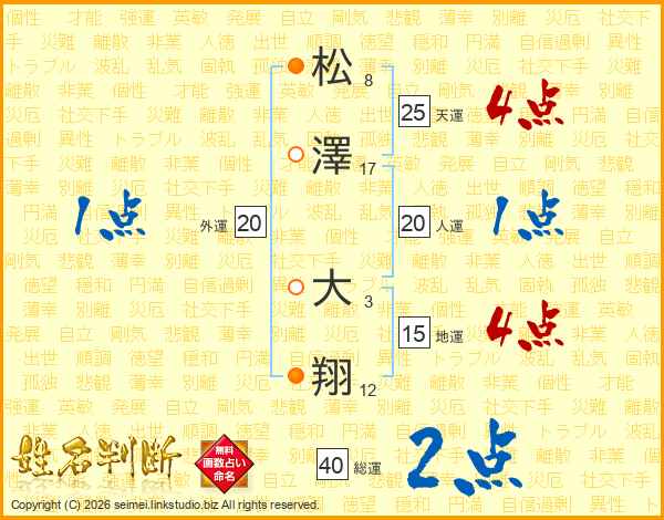 生活面を象徴する運勢です。外部から受ける影響力を表し、結婚運、家庭運や職場、環境への順応性を表します。総運から人運を引いた画数。姓や名が1文字の場合を除く。