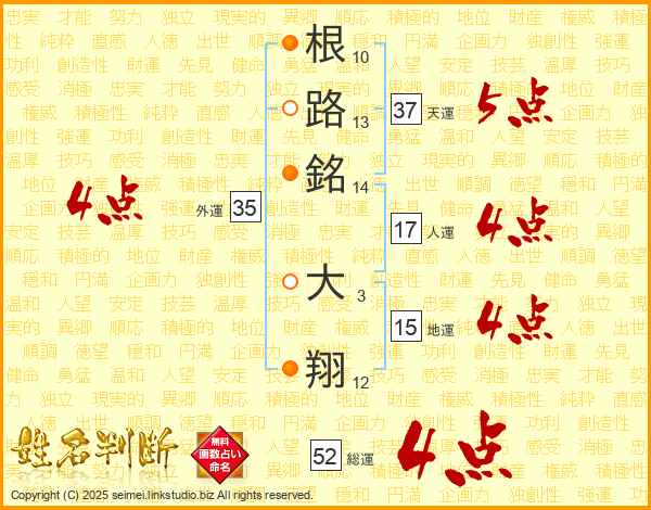 根(10画)路(13画)銘(14画) 大(3画)翔(12画)