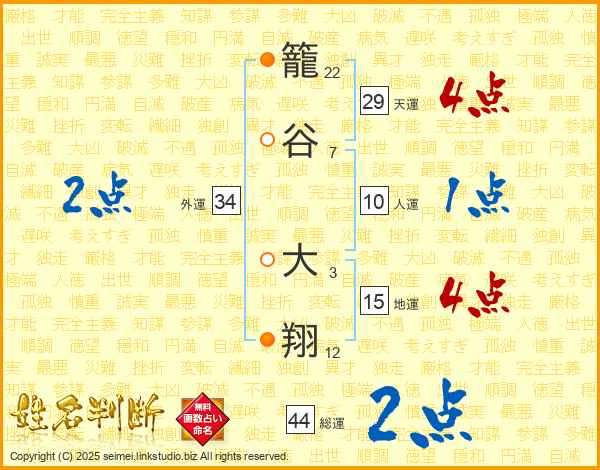 籠(22画)谷(7画) 大(3画)翔(12画)
