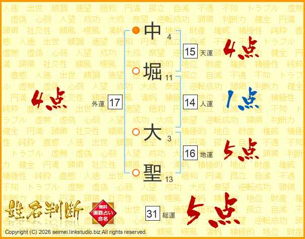 生活面を象徴する運勢です。外部から受ける影響力を表し、結婚運、家庭運や職場、環境への順応性を表します。総運から人運を引いた画数。姓や名が1文字の場合を除く。