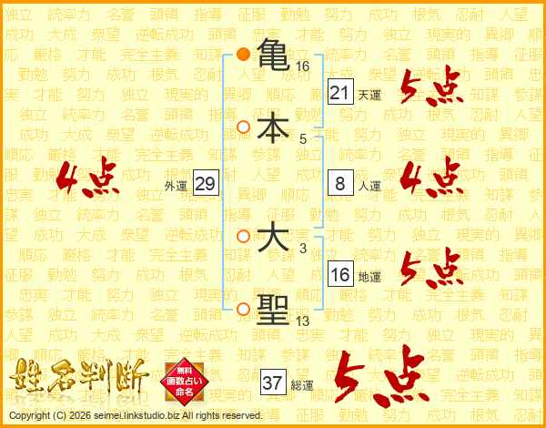 亀(16画)本(5画) 大(3画)聖(13画)