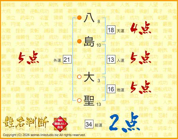 あなたの人生を表す1番重要な運勢です。生涯を通じて影響する総合運となり、主に50歳以降の晩年期に影響を及ぼします。苗字と名前の合計画数。