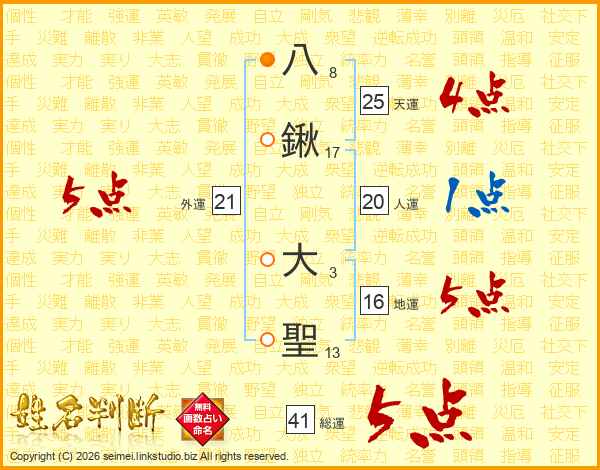 八鍬大聖さんの総運は41画の5点!