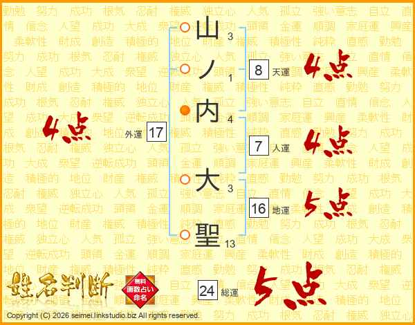山(3画)ノ(1画)内(4画) 大(3画)聖(13画)