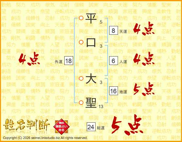 あなたの人生を表す1番重要な運勢です。生涯を通じて影響する総合運となり、主に50歳以降の晩年期に影響を及ぼします。苗字と名前の合計画数。