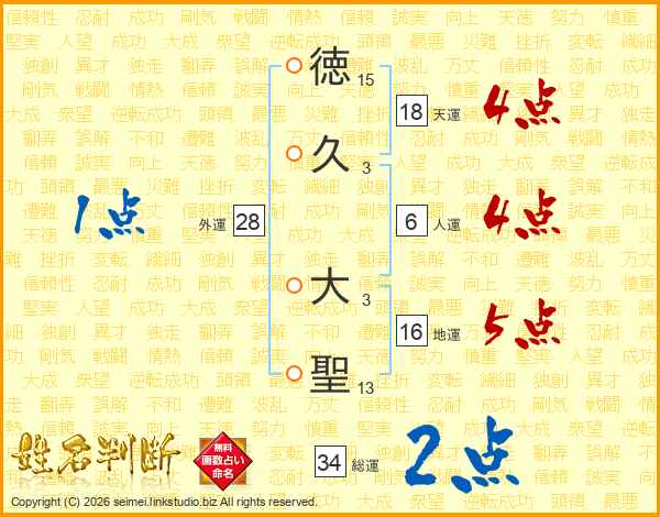 徳(15画)久(3画) 大(3画)聖(13画)