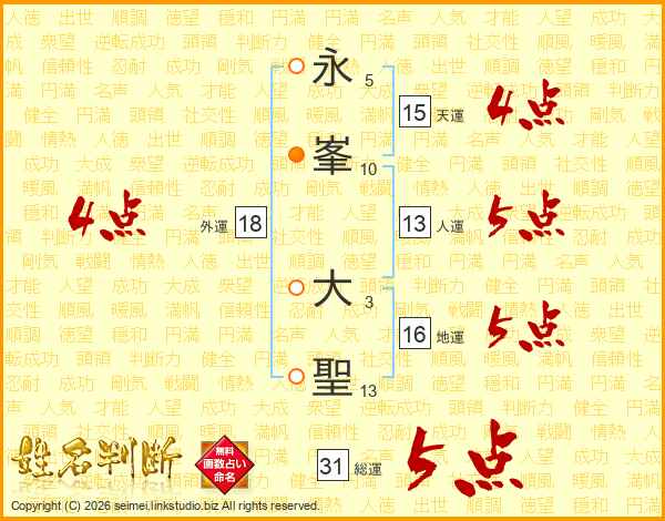 あなたの人生を表す1番重要な運勢です。生涯を通じて影響する総合運となり、主に50歳以降の晩年期に影響を及ぼします。苗字と名前の合計画数。