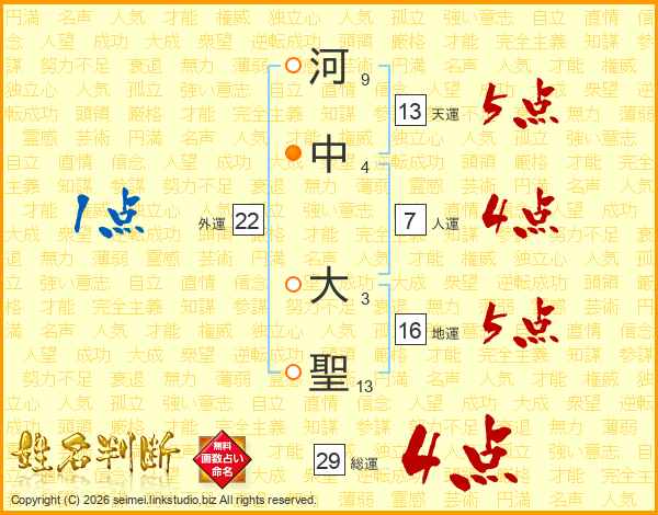 あなたの人生を表す1番重要な運勢です。生涯を通じて影響する総合運となり、主に50歳以降の晩年期に影響を及ぼします。苗字と名前の合計画数。