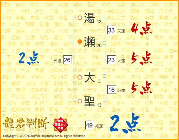 湯(13画)瀬(20画) 大(3画)聖(13画)