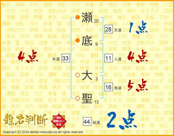 瀬(20画)底(8画) 大(3画)聖(13画)