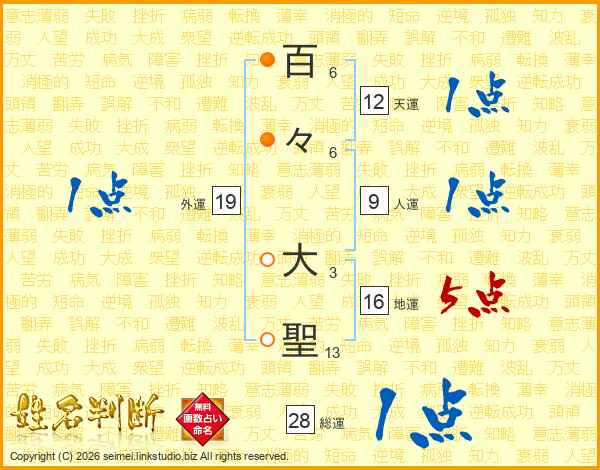 あなたの人生を表す1番重要な運勢です。生涯を通じて影響する総合運となり、主に50歳以降の晩年期に影響を及ぼします。苗字と名前の合計画数。