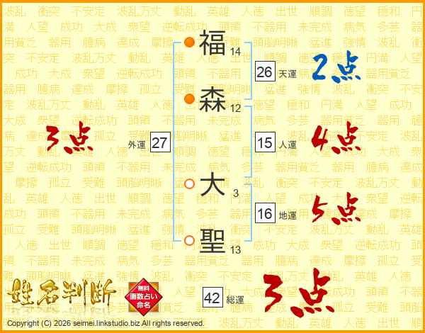 あなたの人生を表す1番重要な運勢です。生涯を通じて影響する総合運となり、主に50歳以降の晩年期に影響を及ぼします。苗字と名前の合計画数。