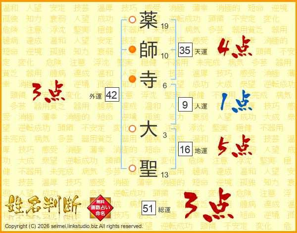 薬(19画)師(10画)寺(6画) 大(3画)聖(13画)