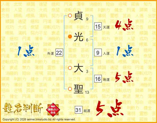 あなたの人生を表す1番重要な運勢です。生涯を通じて影響する総合運となり、主に50歳以降の晩年期に影響を及ぼします。苗字と名前の合計画数。