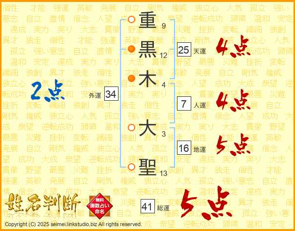 重(9画)黒(12画)木(4画) 大(3画)聖(13画)