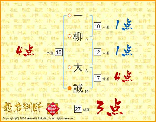 生活面を象徴する運勢です。外部から受ける影響力を表し、結婚運、家庭運や職場、環境への順応性を表します。総運から人運を引いた画数。姓や名が1文字の場合を除く。