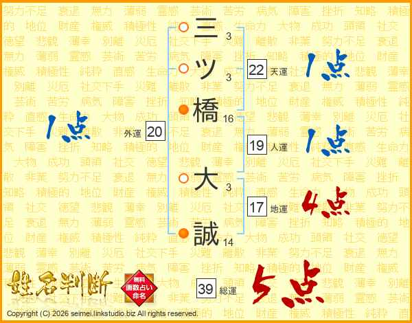 三(3画)ツ(3画)橋(16画) 大(3画)誠(14画)