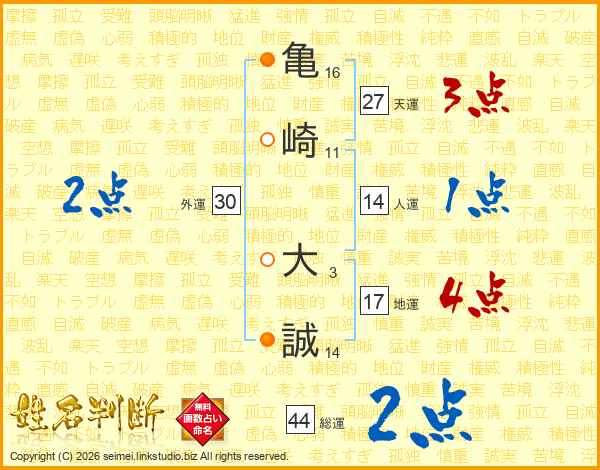 亀(16画)崎(11画) 大(3画)誠(14画)