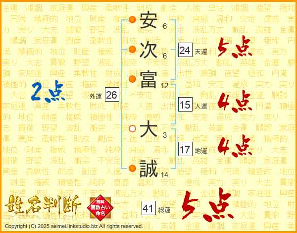安(6画)次(6画)富(12画) 大(3画)誠(14画)