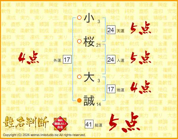 生活面を象徴する運勢です。外部から受ける影響力を表し、結婚運、家庭運や職場、環境への順応性を表します。総運から人運を引いた画数。姓や名が1文字の場合を除く。